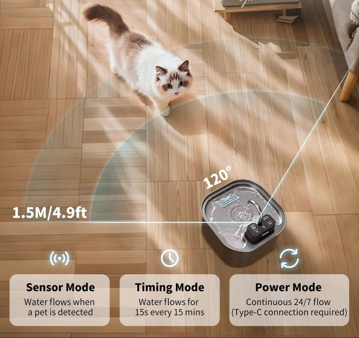 Our intelligent motion sensor detects your cat within 1.5m / 120°, automatically activating a gentle flow of fresh water.